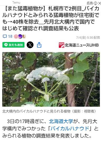 バイカルハナウドという毒を持つ外来種が北大敷地内で発見されたニュースを観た。 その後すぐに白石区、ココロードで、40株発見のニュース。 マジかぁ~! ご近所でした。 報道の画像から場所特定出来た。 『う~ん 時々そこは通ってる』 昨日も近くを歩いて…
